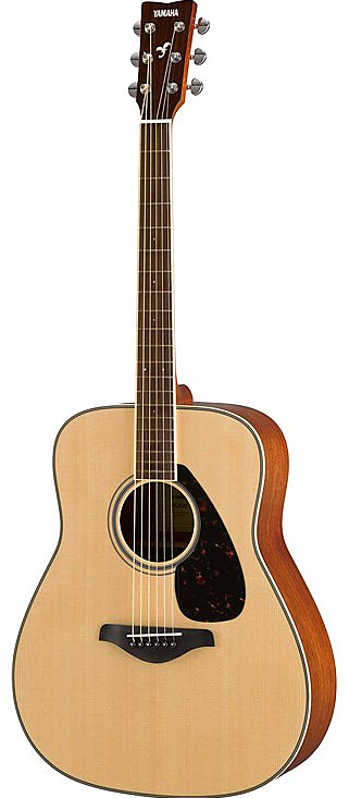 FG820 is an affordable acoustic guitar, perfect for the beginners and players who want a reliable companion for a campfire concert. It is a maember of the FG series (Yamaha`s first to feature a dreadnought steel-stringer) and ranks among its opening models (together with the rest of the FG820 and FG800 models). Main features include a non-cutaway dreadnought body (w/electronics-free construction, modern bracing, mahogany back/sides, solid spruce top, tortoise pickguard), 25-9/16" scale, and stock hardware. The color palette has five options - Natural, Autumn Burst, Sunset Blue, Black, and Brown Sunburst. All five have the same price tag - $420.00 (MSRP). FG820 also features a comfortable nato neck (attached at the 14th fret), 20-fret rosewood fingerboard, fixed rosewood bridge, and die-cast tuners.