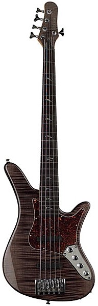 SB5001 is a five-stringed electric bass with a double cutaway body made of alder back and flamed maple top. The body top is flat, finished in gloss and equipped with a vintage-shaped plastic pickguard. Besides flamed maple, Carvin offers a wide variety of optional top wood covers. In the bridge section, SB5002 features a fixed bridge with string-through construction and chrome plating. Other plating options are also available. In the pickups area, Carvin installs two single coil pickups laid out in J/J formation. They are controlled through a setup of master tone and split volume knobs. Neck on this model is made of maple and it is bolted to the body. This neck is primarily topped with ebony fingerboard, though maple and other options also exist.