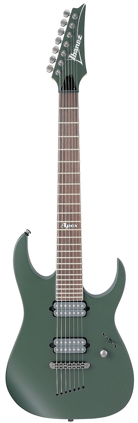 APEX2 is one of three models from the current lineup of the Munky signature series. This series and all of it`s models are made by Ibanez Guitars. Body of this particular model is taken from the famed RG series, it`s solid, double-cut and has a flat top. It`s made of mahogany in it`s entirety. Green Shadow Flat is the only color scheme available for this model and it is finished in satin. One-piece bridge section on this model has a tune-o-matic bridge with string-through-body construction. Passive pickups are installed in H/H configuration and are controlled with the most basic controls unit. Maple neck runs through the body on this seven-string axe and it`s topped with a 24-fret rosewood fingerboard.
