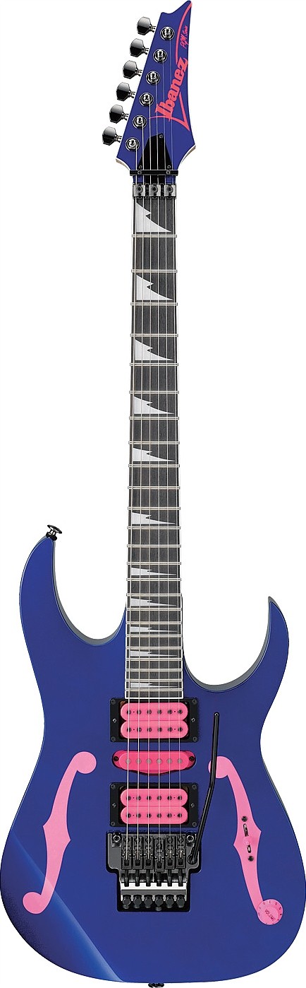 PGM100RE is a model from the Paul Gilbert signature series of electric guitars. It comes with a solid, double-cut body made of basswood. It is flat, it has no binding, nor does Ibanez install a pickguard on this model. Also, there is no top wood cover. However, the color scheme makes this one stand out from the crowd. It` Jewel Blue and it is finished in high gloss. Bridge section on this model is equipped with an Ibanez Edge locking trem system. This bridge is matched with a locking nut on the opposite side of the 25-1/2" scale. Pickups are painted pink and come in H/S/H configuration. Neck on this model is made of five pieces of maple and it`s bolted to the body. It`s topped with a 24-fret rosewood fingerboard.