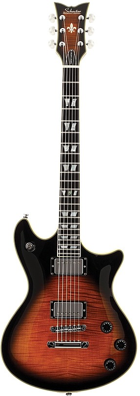 Tempest Custom is the top model in Schecter`s Tempest series. It comes with a solid, double-cut body with carved top and set in neck joint. It is made of mahogany back and maple top. Top panel features unique Tempest series carve and it can be made either of plain maple, or flamed maple. Dark Vintage Sunburst and Faded Vintage Sunburst color options have flamed maple cap, while the black Tempest Customs come with plain maple tops. All three variants are equipped with chrome hardware and high gloss finish. Tune-o-matic bridge on Tempest Custom is paired with a stoptail bar. Active Seymour Duncan humbuckers are installed in the front. Coils of these pickups can be split. Set in mahogany neck is topped with a 22-fret ebony fingerboard.